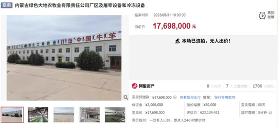 2025年8月31日,綠色公司的廠區(qū)及屠宰設(shè)備和冷凍設(shè)備等資產(chǎn),在阿里法拍平臺(tái)上為期60天的變賣(mài)結(jié)束。這些資產(chǎn)兩年來(lái)已六次進(jìn)行法拍,價(jià)格從2313萬(wàn)元降至1769.8萬(wàn)元,但這次變賣(mài)依然無(wú)人問(wèn)津。