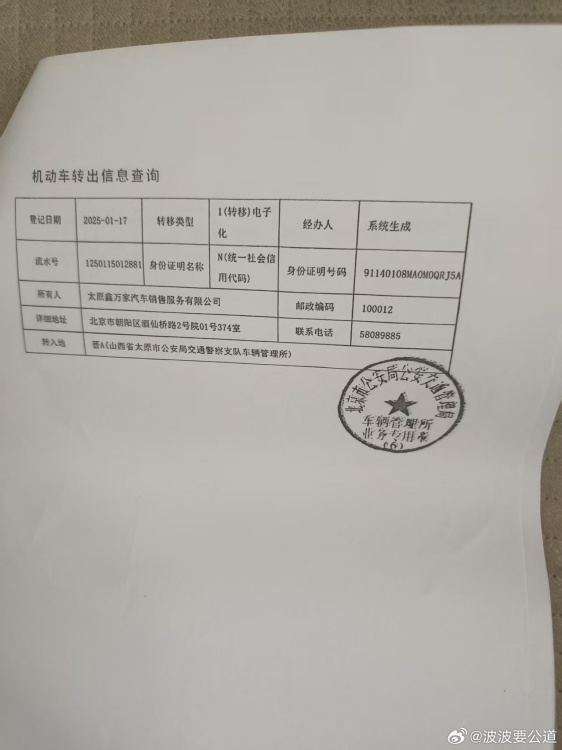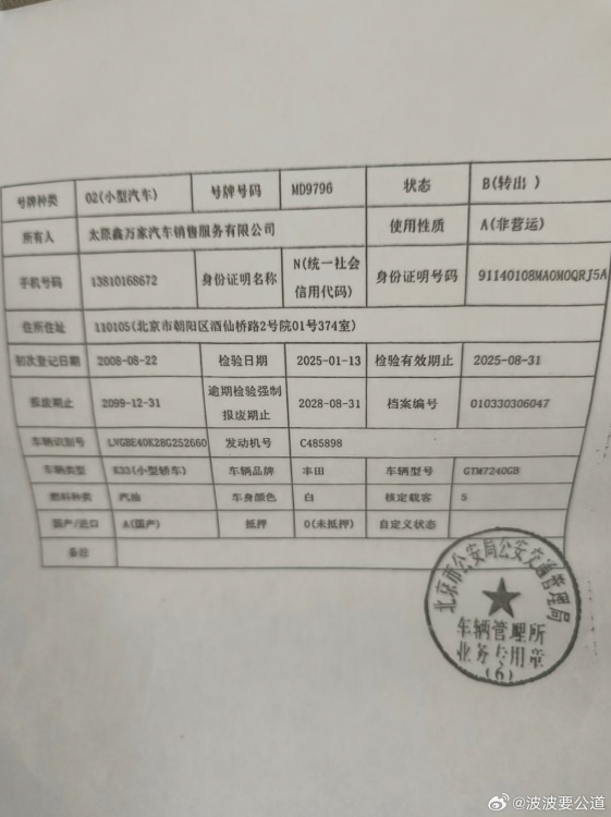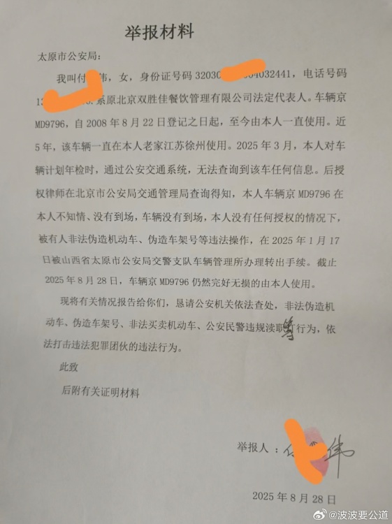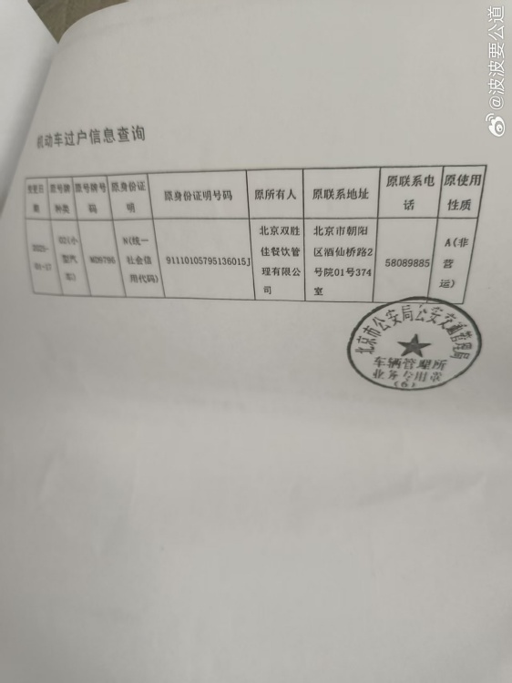 本人系原北京雙勝佳餐飲管理有限公司法定代表人,車輛京MD9796自2008年8月22日登記之日起,至今由本人一直使用。近5年,該車輛一直在徐州使用。2025年3月,本人對(duì)車輛年檢時(shí),通過(guò)公安交通系統(tǒng),無(wú)法查詢到該車任何信息。后授權(quán)律師在北京市公安局交通管理局查詢得知,車輛京MD9796在本人沒(méi)有到場(chǎng),原車輛沒(méi)有到場(chǎng)的情況下,被有人非法偽造機(jī)動(dòng)車、偽造車架號(hào)等違法操作,于2025年1月17日被山西省太原市公安局交警支隊(duì)萬(wàn)國(guó)車輛管理所辦理轉(zhuǎn)出手續(xù)。