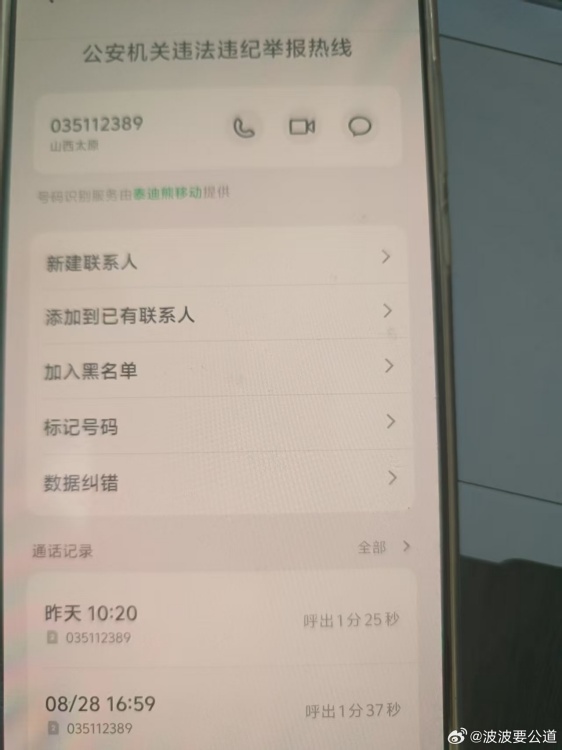 8月24、8月27、8月28日,本人先后多次撥打035112389舉報(bào)電話,一直無(wú)法打通。太原市公安局信訪處的一名男性民警在接受舉報(bào)材料時(shí)說(shuō),太原公安局舉報(bào)電話只有一個(gè)人接聽(tīng),很難打通,很少有人打通。