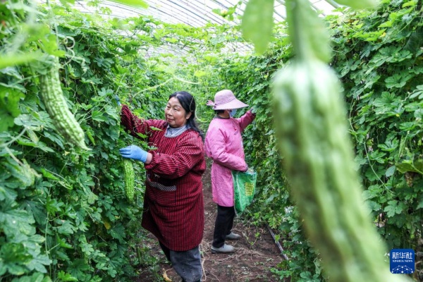 10月19日,在河南省焦作市博愛縣孝敬鎮(zhèn)博愛源蔬菜專業(yè)合作社,社員們在采摘苦瓜供應鄭州、洛陽等地。