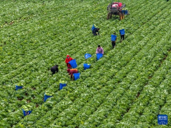 10月19日,在山東省聊城市茌平區(qū)振興街道蔬菜種植基地,農(nóng)民收獲甘藍,準備供應濟南等地(無人機照片)。