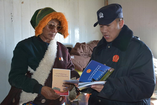 12月20日,在瑪多縣一戶牧民家中,法院的工作人員正在向牧民群眾宣傳法律知識(shí)。(柳澤興 攝)
