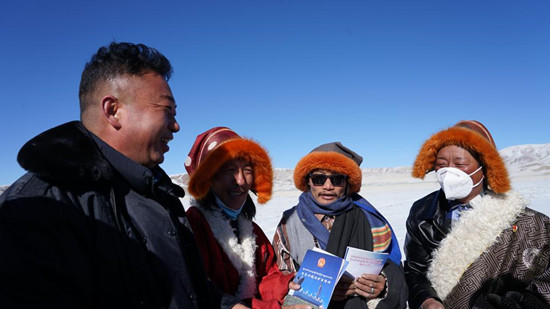 12月20日,瑪多縣人民法院院長(zhǎng)錢快乾在雪后草原上為當(dāng)?shù)啬羺^(qū)群眾普及法律知識(shí)。(李寧 攝)