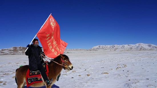 12月20日,瑪多縣人民法院院長(zhǎng)錢快乾騎著馬,擎著“瑪多法院巡回法庭”的旗子,帶領(lǐng)法院工作者下鄉(xiāng)普法宣傳。(李寧 攝)