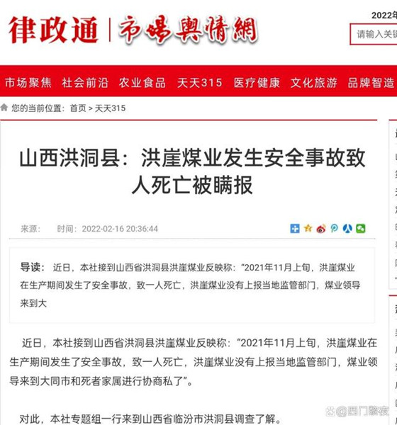 近日,本社接到山西省洪洞縣洪崖煤業(yè)反映稱:“2021年11月上旬,洪崖煤業(yè)在生產(chǎn)期間發(fā)生了安全事故,致一人死亡,洪崖煤業(yè)沒有上報當?shù)乇O(jiān)管部門,煤業(yè)領導來到大同市和死者家屬進行協(xié)商私了”。 對此,本社專題組一行來到山西省臨汾市洪洞縣調(diào)查了解。