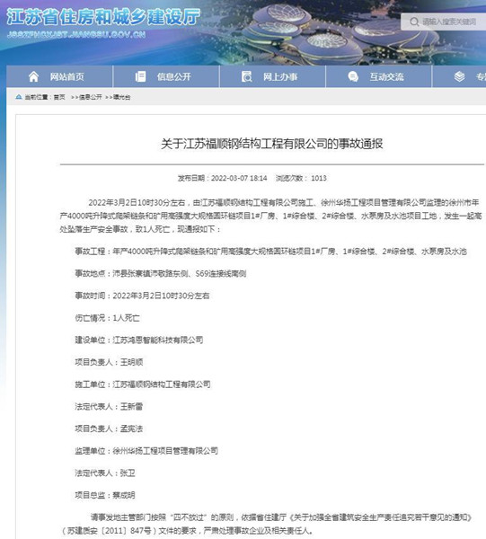 據(jù)江蘇省住房和城鄉(xiāng)建設廳2022年3月7日發(fā)布的《關于江蘇福順鋼結構工程有限公司的事故通報》顯示,2022年3月2日10時30分左右,由江蘇福順鋼結構工程有限公司施工、徐州華揚工程項目管理有限公司監(jiān)理的徐州市年產4000噸升降式爬架鏈條和礦用高強度大規(guī)格圓環(huán)鏈項目1#廠房、1#綜合樓、2#綜合樓、水泵房及水池項目工地,發(fā)生一起高處墜落生產安全事故,致1人死亡。