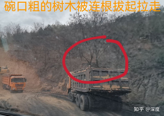 該廠打著填溝造地的名義,派大型挖掘機進入溝內(nèi)作業(yè),通過破壞溝兩側(cè)的退耕還林地,取土遮蓋煤矸石,掩蓋非法排污的行為。毀林現(xiàn)場,慘不忍睹。大量的樹木直接被挖機連根挖起,和黃土一并被卡車拉走,再倒在煤矸石堆上。