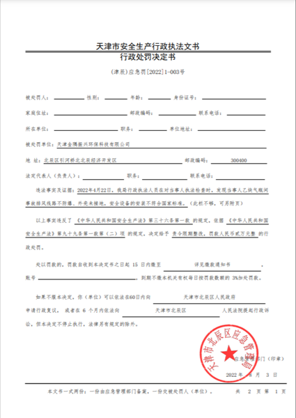 天津市北辰區(qū)人民政府官網(wǎng)獲悉,2022年6月6日,天津市北辰區(qū)應(yīng)急管理局作出一份行政處罰決定((津辰)應(yīng)[2022]1-003號),指向天津金隅振興環(huán)??萍加邢薰?以下簡稱“金隅振興”)。