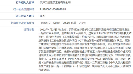 “〔津河?xùn)|〕應(yīng)急罰〔2022〕監(jiān)管—013號(hào)”行政處罰信息顯示,2022年4月27日7時(shí)左右,河?xùn)|區(qū)光華路2號(hào)二宮公園改造提升項(xiàng)目施工現(xiàn)場(chǎng)發(fā)生一起生產(chǎn)安全事故,造成1名施工人員重傷,送醫(yī)后于4月30日23時(shí)左右經(jīng)搶救無(wú)效死亡,直接經(jīng)濟(jì)損失(不含事故罰款)約107萬(wàn)元。