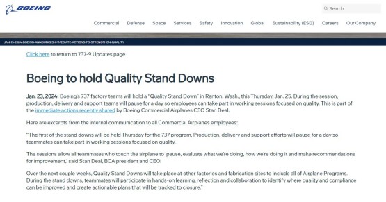 波音民用飛機集團總裁兼首席執(zhí)行官斯坦·迪爾(Stan Deal)表示,該會議讓所有接觸飛機的員工“暫停下來,評估我們正在做什么、如何做,并提出改進建議”。公告還稱,在接下來的幾周里,其他工廠和制造基地也將開展“質(zhì)量停工”,包括所有飛機項目。