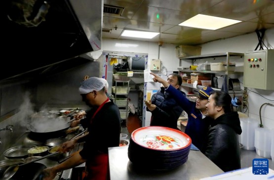 1月24日,在上海定西路美食街一家餐飲店內(nèi),長寧區(qū)消防救援支隊(duì)消防指導(dǎo)員與店員一起查看油煙機(jī)上方的自動(dòng)噴淋裝置。