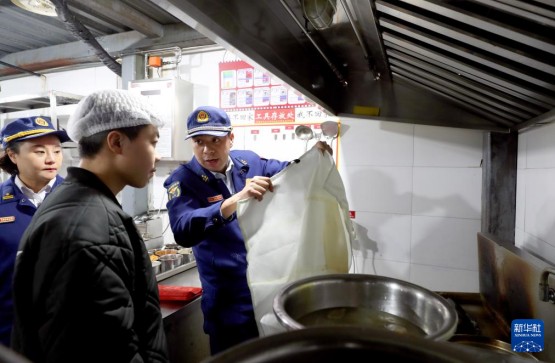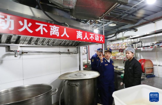 1月24日,在上海定西路美食街一家餐飲店內(nèi),長寧區(qū)消防救援支隊(duì)消防指導(dǎo)員查看后廚消防設(shè)施。