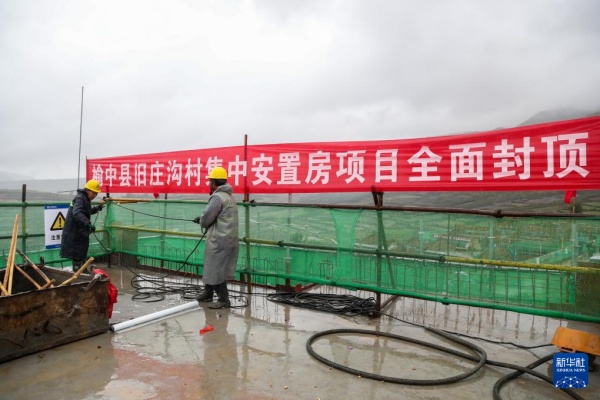 10月1日,在榆中縣馬坡鄉(xiāng)舊莊溝村集中安置點封頂儀式現(xiàn)場,工人在房頂整理施工設(shè)備。