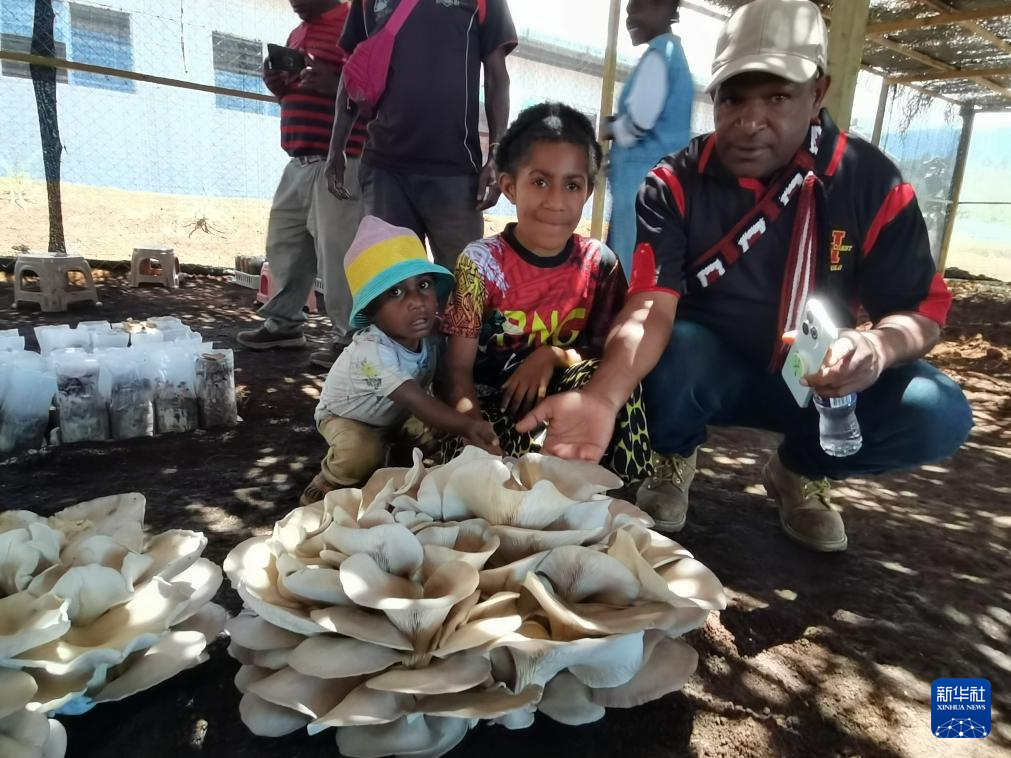 9月29日,在巴布亞新幾內(nèi)亞東高地省首府戈羅卡市,當(dāng)?shù)孛癖妳⒂^中國援巴布亞新幾內(nèi)亞菌草旱稻項(xiàng)目永久性示范基地種植的大平菇。