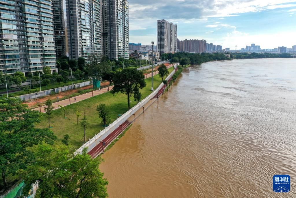 10月3日,郁江廣西南寧城區(qū)河段(邕江)水位持續(xù)上漲,部分江邊步道被淹(無人機(jī)照片)。