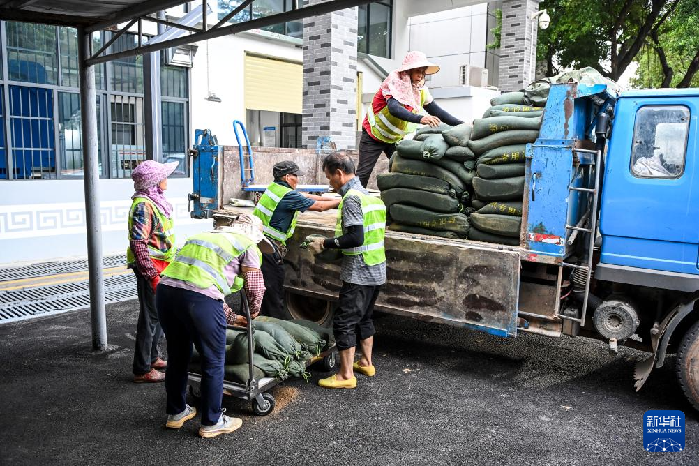 10月3日,南寧市水利部門的工作人員在搬運(yùn)應(yīng)急防汛沙包。