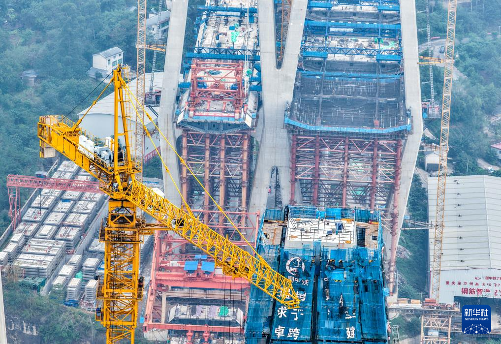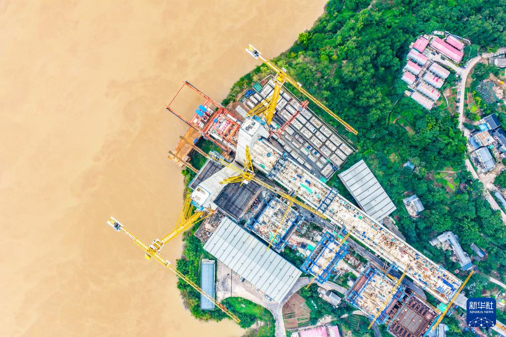 這是10月17日拍攝的渝萬高鐵石沱長江大橋建設現場(無人機照片)。