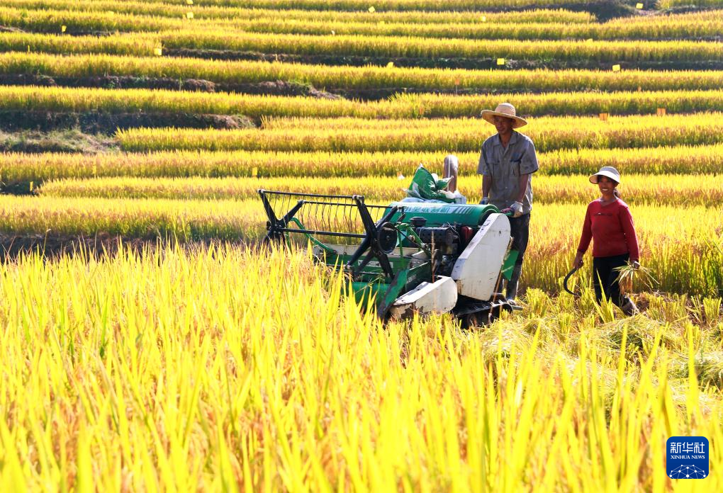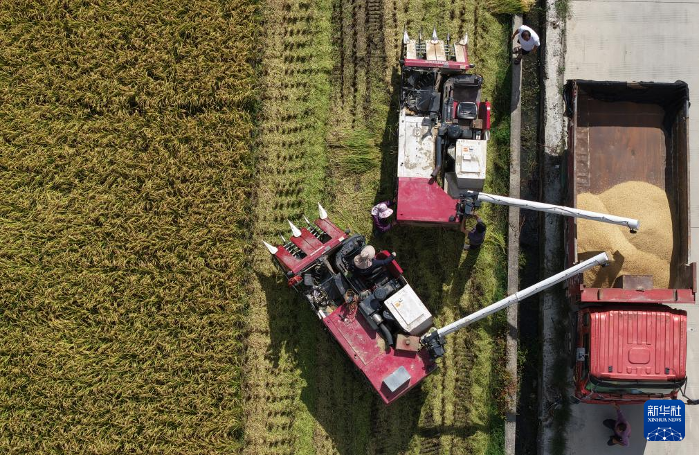 10月10日,湖北省宜昌市秭歸縣沙鎮(zhèn)溪鎮(zhèn)長春村村民駕駛農(nóng)機(jī)在田間收獲水稻。