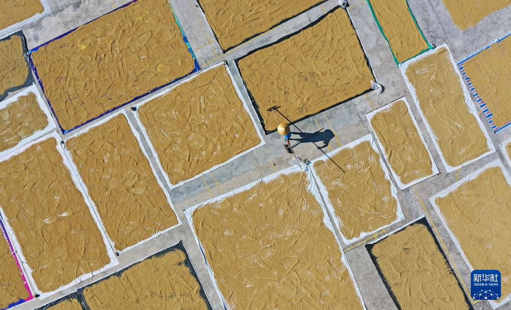 10月10日,浙江省臺州市仙居縣官路鎮(zhèn)增仁村農(nóng)民在晾曬稻谷(無人機(jī)照片)。