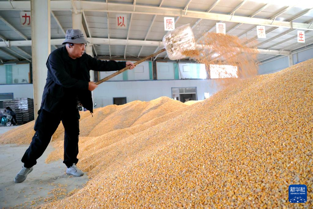10月10日,在山東省濱州市高新區(qū)小營街道一處糧食烘干服務(wù)點,工作人員整理烘干后的玉米。