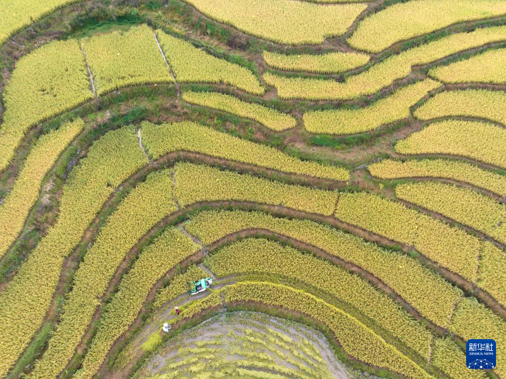 10月10日,湖北省宜昌市秭歸縣沙鎮(zhèn)溪鎮(zhèn)長春村村民駕駛農(nóng)機(jī)在田間收獲水稻(無人機(jī)照片)。