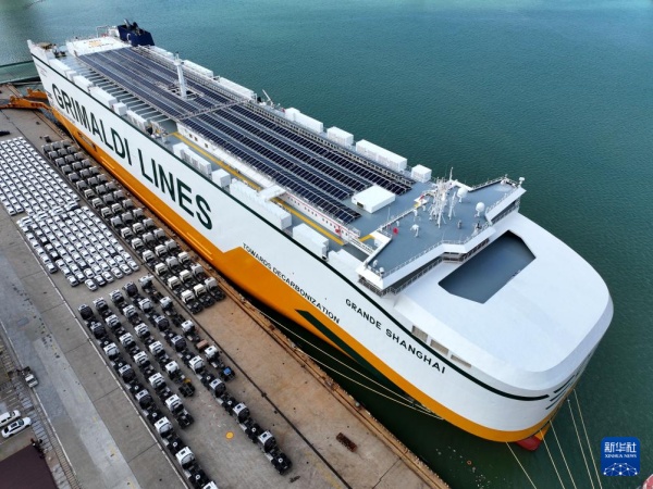 10月14日,在江蘇省連云港港東方港務(wù)分公司碼頭,滾裝輪裝載汽車準(zhǔn)備外運(yùn)(無(wú)人機(jī)照片)。