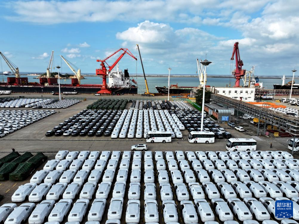 10月14日,在江蘇省連云港港東方港務(wù)分公司碼頭,大批汽車準(zhǔn)備裝船外運(yùn)(無(wú)人機(jī)照片)。