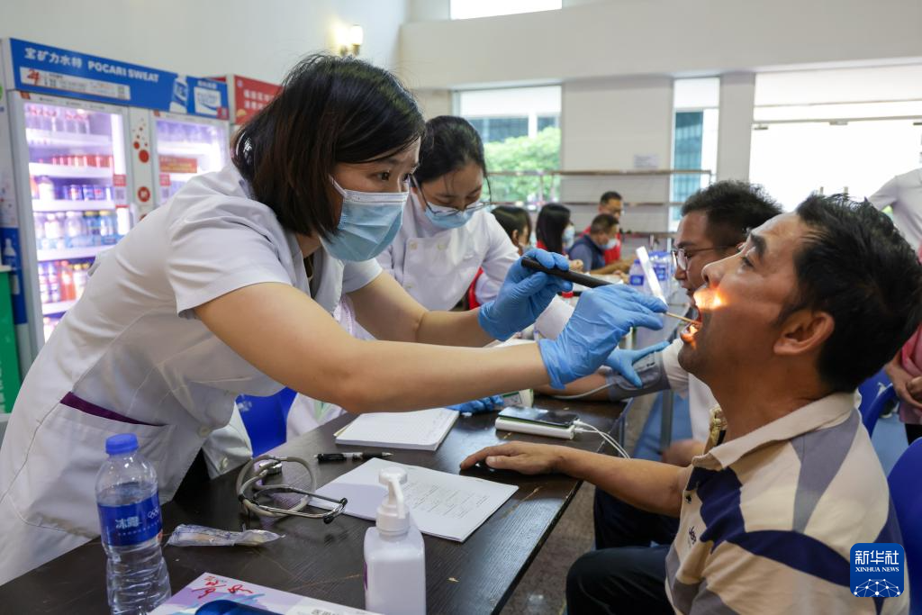 9月23日,在深圳大學粵海校區(qū)羽毛球館,社區(qū)醫(yī)務(wù)人員為避險群眾進行身體檢查。
