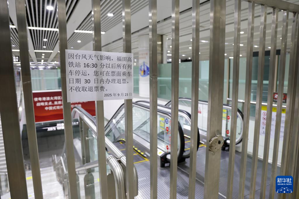 9月23日,深圳福田高鐵站的進站閘門已關(guān)閉,門口張貼著因臺風停運的告示。