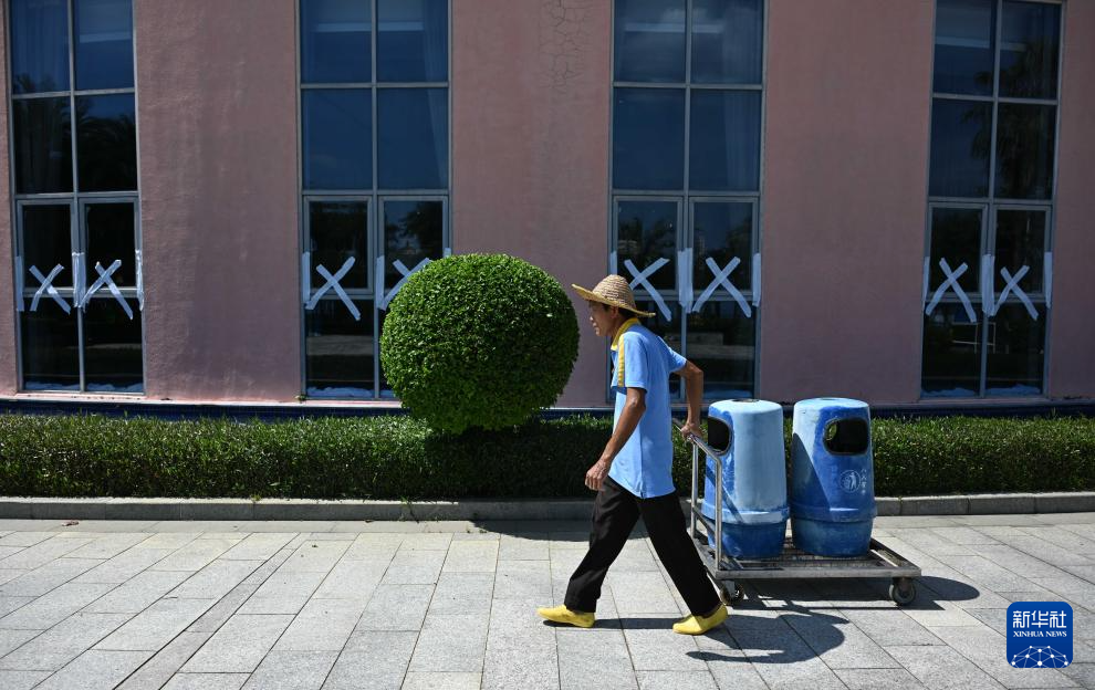 9月23日,在廣東陽江市海陵島一酒店,工作人員提前轉(zhuǎn)移海邊的垃圾桶。