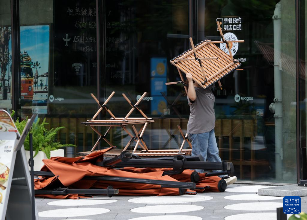 9月23日,在深圳市福田區(qū)一處商場,臨街餐館的服務(wù)員收拾室外桌椅設(shè)施。