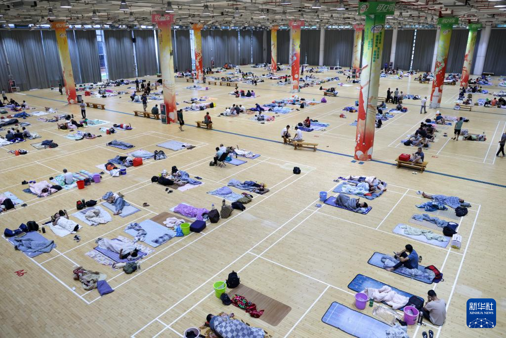 9月23日,在深圳大學粵海校區(qū)羽毛球館,避險群眾在場館內(nèi)休息。