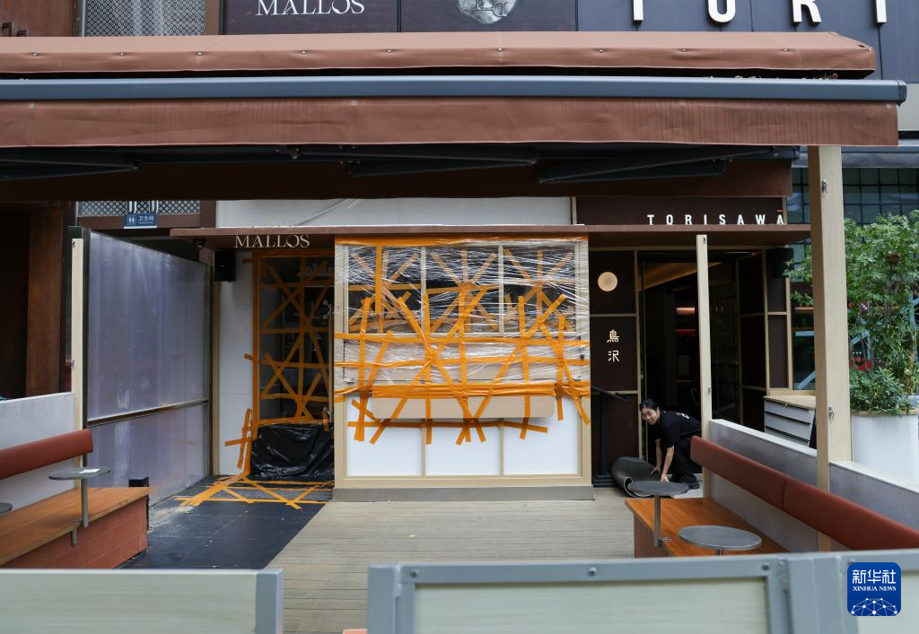 9月23日,在廣東江門市的沈海高速梁金山服務(wù)區(qū),落地玻璃大門外已經(jīng)安裝了防風木板。