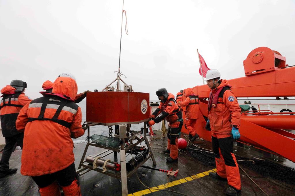 隊員們在艉甲板回收Lander。新華社記者劉詩平 攝