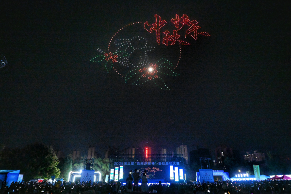 開場舞《漁悅歡歌》以舞姿勾勒臨湘山水之秀、通過融入拋竿、刺魚、收線等動作,展現(xiàn)垂釣文化之韻;空中無人機表演依次浮現(xiàn)臨湘浮標、知名釣具品牌標識及地域特色元素,將現(xiàn)場氛圍感拉滿。