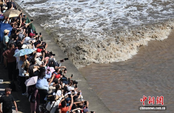 10月9日,錢塘江大潮向上游奔涌。當(dāng)日是農(nóng)歷八月十八,錢塘江迎來大潮汛,在浙江嘉興海寧鹽官,眾多游客爭睹“八月十八潮”,感受錢塘江大潮的洶涌壯觀。