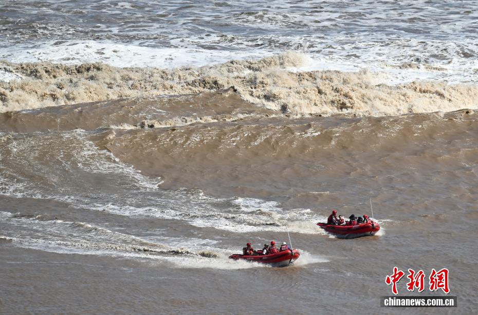 10月9日,兩艘快艇伴隨錢塘江大潮潮頭向上游駛?cè)?。?dāng)日是農(nóng)歷八月十八,錢塘江迎來大潮汛,在浙江嘉興海寧鹽官,眾多游客爭睹“八月十八潮”,感受錢塘江大潮的洶涌壯觀。