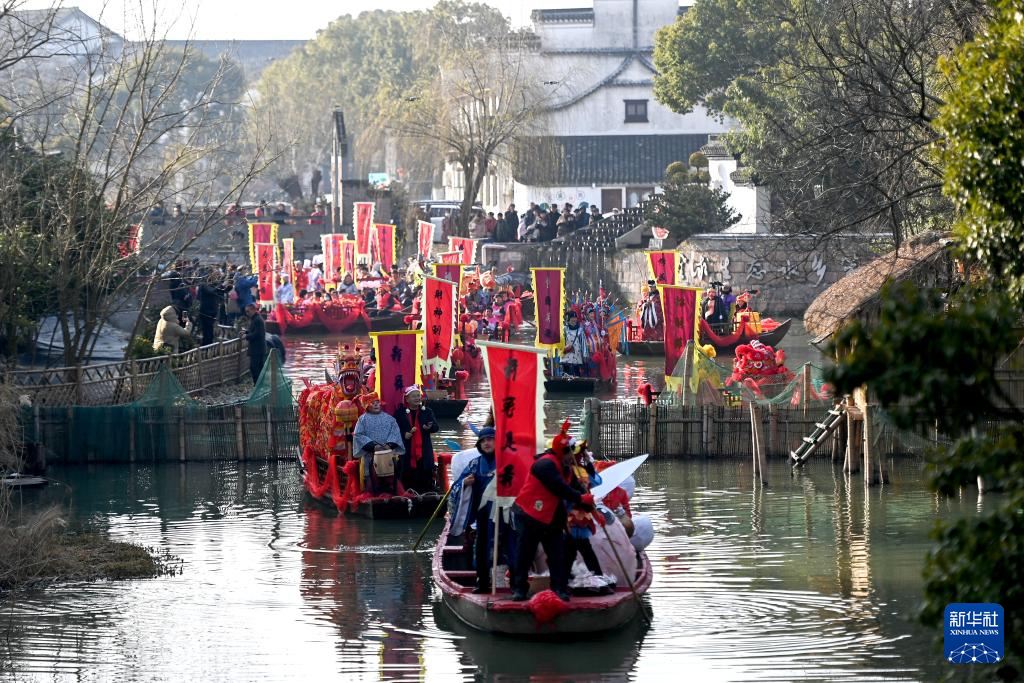 2023年1月26日,在浙江省湖州市南潯區(qū)和孚鎮(zhèn)荻港村,漁船在水上古道巡游。