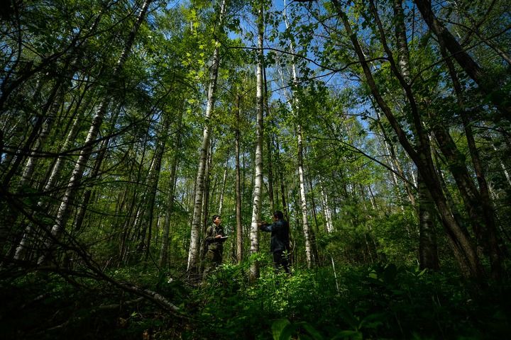 科研工作者在長白山國家級自然保護(hù)區(qū)的植物固定監(jiān)測樣地測量記錄樹木生長數(shù)據(jù)(2024年5月9日攝)。新華社記者 許暢 攝