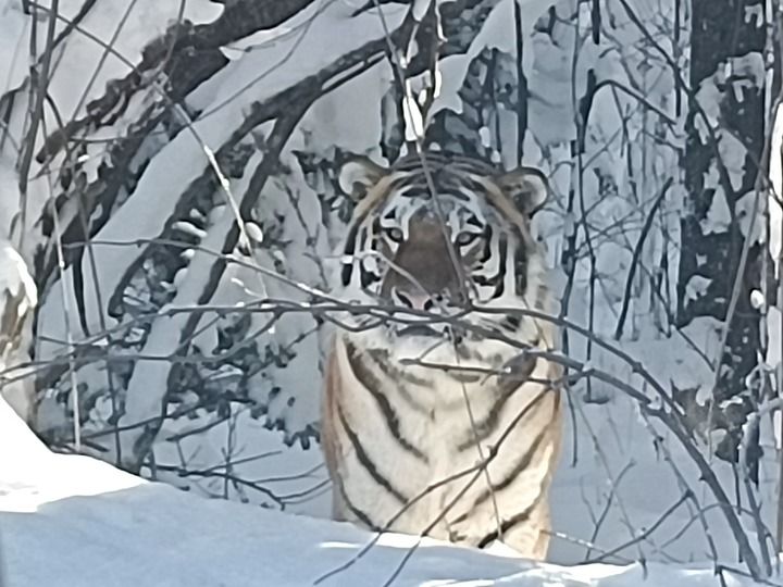 2024年12月3日,工作人員在長白山西坡錦江大峽谷旅游公路沿線附近拍攝到的野生東北虎。(受訪者供圖)