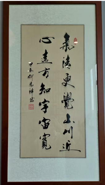 何光澤先生是國家級楹聯(lián)書法家,中國楹聯(lián)學會會員,中山市華僑歷史學會書畫委員會副主任。他的書法作品屢次受邀在省港澳大型書畫展覽中展出,并廣獲藝術(shù)界與公眾好評,這背后是他數(shù)十年來不間斷的淬煉與沉淀。其筆墨間,既有歐楷精嚴的結(jié)構(gòu)之美,又有經(jīng)世事歷練后的沉穩(wěn)之力,更深藏著連州山水人文所滋養(yǎng)出的深厚底蘊。于他,書法不僅是藝術(shù)創(chuàng)作,更是“養(yǎng)心”之道,是他在紛繁商務中保持內(nèi)心寧靜、思維澄明的修行。