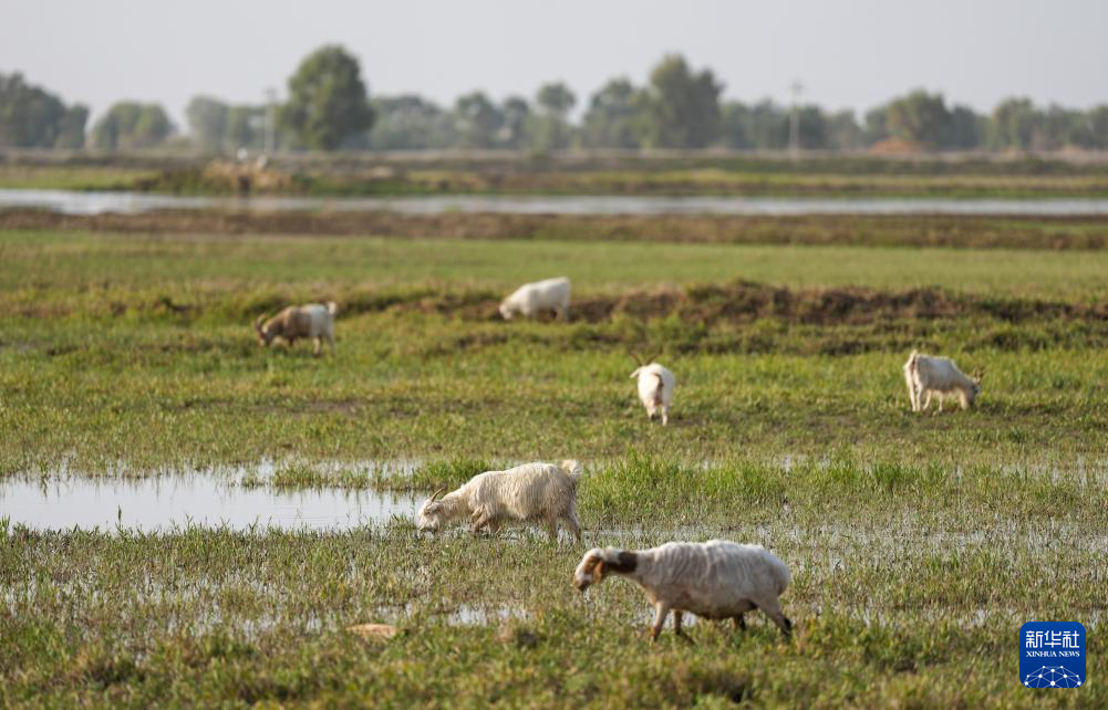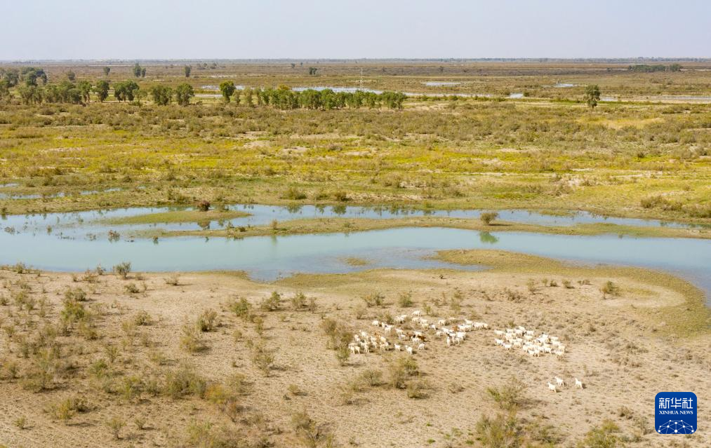 這是9月20日在新疆巴音郭楞蒙古自治州尉犁縣的塔里木河流域濕地拍攝的羊群。