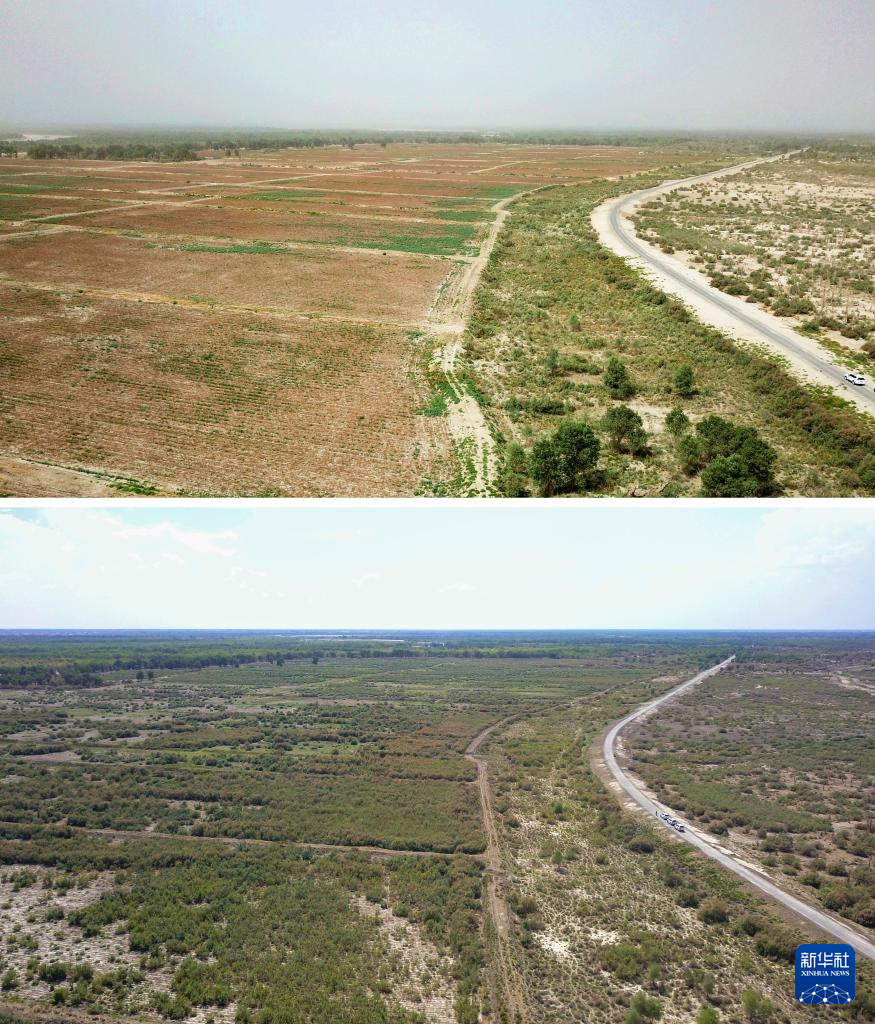 拼版照片:上圖為2017年7月24日拍攝的退耕后的塔里木河干流北岸輸水堤15公里處的胡楊林保護(hù)區(qū)(無人機(jī)照片);下圖為2025年7月拍攝的生態(tài)恢復(fù)后的同一地點(diǎn)(無人機(jī)照片)。該地經(jīng)生態(tài)補(bǔ)水,檉柳、梭梭等天然植被大面積恢復(fù),生長(zhǎng)良好。