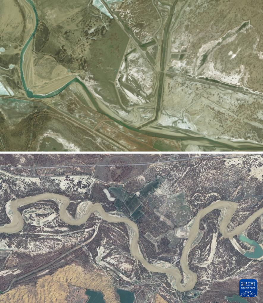 拼版衛(wèi)星照片:上圖為2012年3月24日拍攝的新疆巴音郭楞蒙古自治州尉犁縣喀爾曲尕鄉(xiāng)附近的塔里木河和周邊地區(qū);下圖為2024年8月8日拍攝的新疆巴音郭楞蒙古自治州尉犁縣喀爾曲尕鄉(xiāng)附近的塔里木河和周邊地區(qū)。該地區(qū)植被覆蓋度和胡楊林地面積顯著提升。