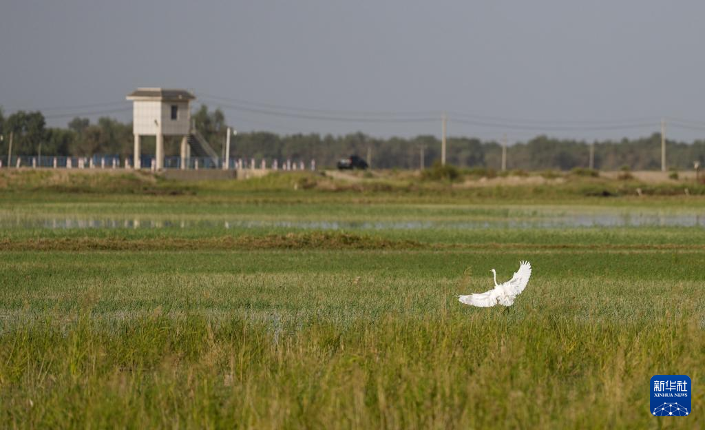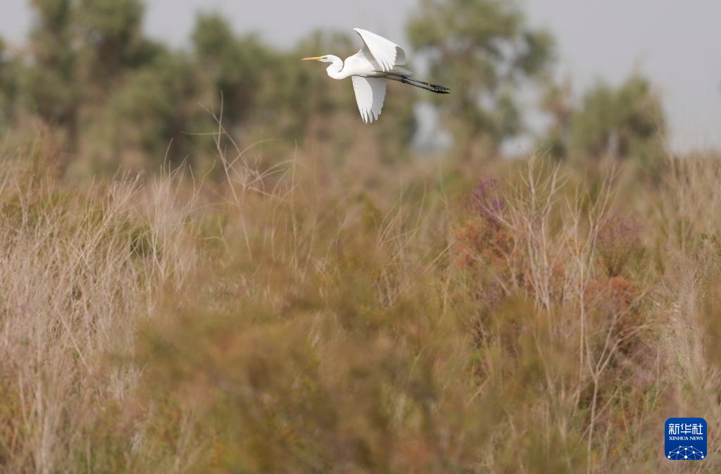 這是9月20日在新疆巴音郭楞蒙古自治州尉犁縣喀爾曲尕鄉(xiāng)附近的塔里木河流域濕地拍攝的白鷺。