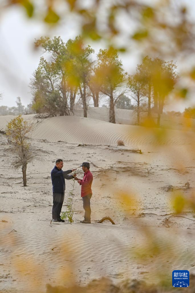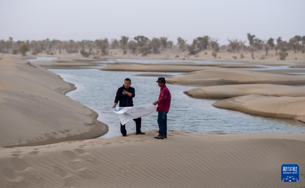 9月19日,在新疆巴音郭楞蒙古自治州尉犁縣境內(nèi)的塔克拉瑪干沙漠引洪補(bǔ)水生態(tài)渠旁,護(hù)林員艾力·尼亞孜(左)和同事在開展工作。