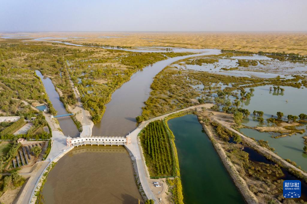 這是9月20日在新疆巴音郭楞蒙古自治州尉犁縣拍攝的塔里木河阿其克河口分水樞紐(無人機(jī)照片)。這是塔里木河流域綜合治理的重要工程之一。