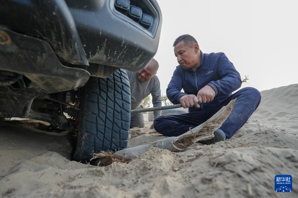 9月19日,在新疆巴音郭楞蒙古自治州尉犁縣的塔克拉瑪干沙漠內(nèi),護(hù)林員艾力·尼亞孜(右)和同事在修車。