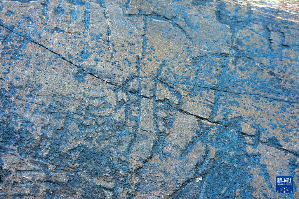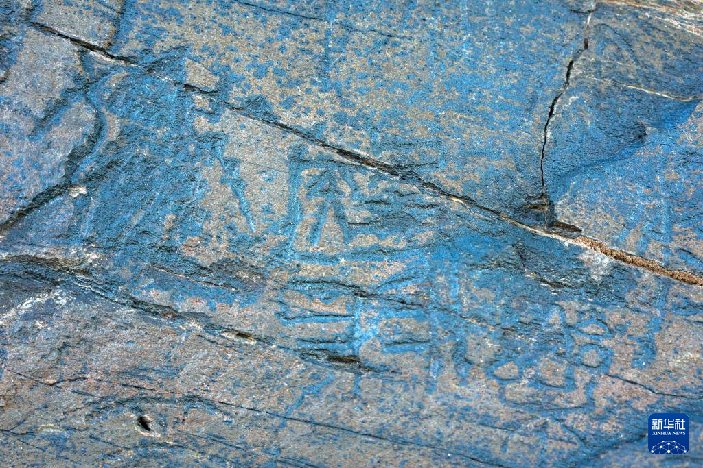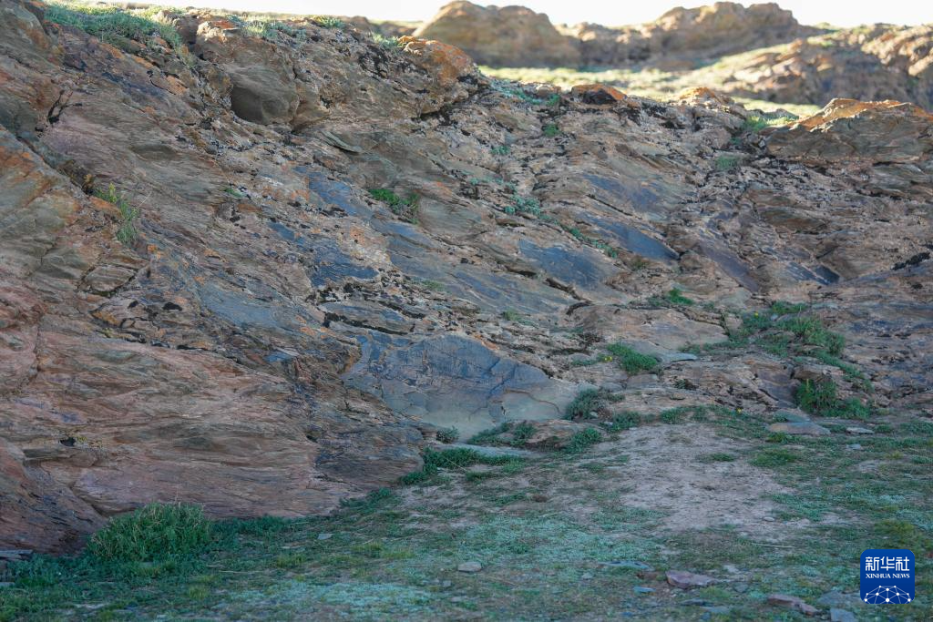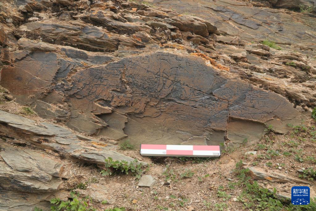 文物考古工作者于2023年7月在青海省瑪多縣扎陵湖畔對(duì)尕日塘秦刻石進(jìn)行現(xiàn)場(chǎng)考察時(shí)拍攝的該刻石遺跡照片。