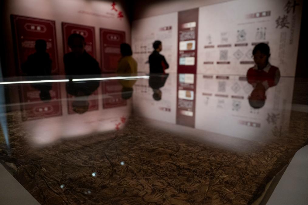 首次全貌展出的蟠龍飛鳳紋繡淺黃絹面衾。新華社記者 伍志尊 攝